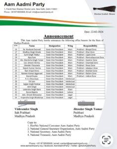 आम आदमी पार्टी ने मध्य प्रदेश में संगठन में नियुक्तियों की सूची जारी कर दी है। एडवोकेट कमल गुप्ता को प्रदेश उपाध्यक्ष नियुक्त कर इंदौर ज़ोन का प्रभार सौंपा है।
