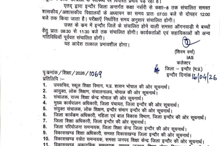 कलेक्टर इंदौर शिवम् वर्मा ने इंदौर के सभी सरकारी, प्राइवेट, सीबीएसई स्कूलों का टाईम भीषण गर्मी के चलते परिवर्तित कर दिया है।इस संबंध में आदेश जारी कर दिया है।