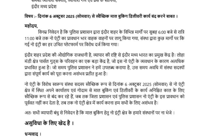 इंदौर शहर में भारी वाहनों की नो एंट्री का ट्रांसपोर्टरों का विरोध, बंद का आह्वान।