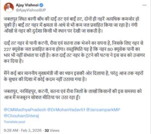 “अजय विश्नोई ने अपने X पर पोस्ट की। लिखा कि जबलपुर स्थित बरगी बांध की दोनों ही नहरें (दाईं तट एवं बाईं तट) अत्यधिक कमजोर हो चुकी हैं। बाईं तट नहर में क्षमता से आधे से भी कम जल प्रवाहित किया जा रहा है। नंगी आंखों से नहर की दुर्दशा किसी भी स्थान पर देखी जा सकती है।”