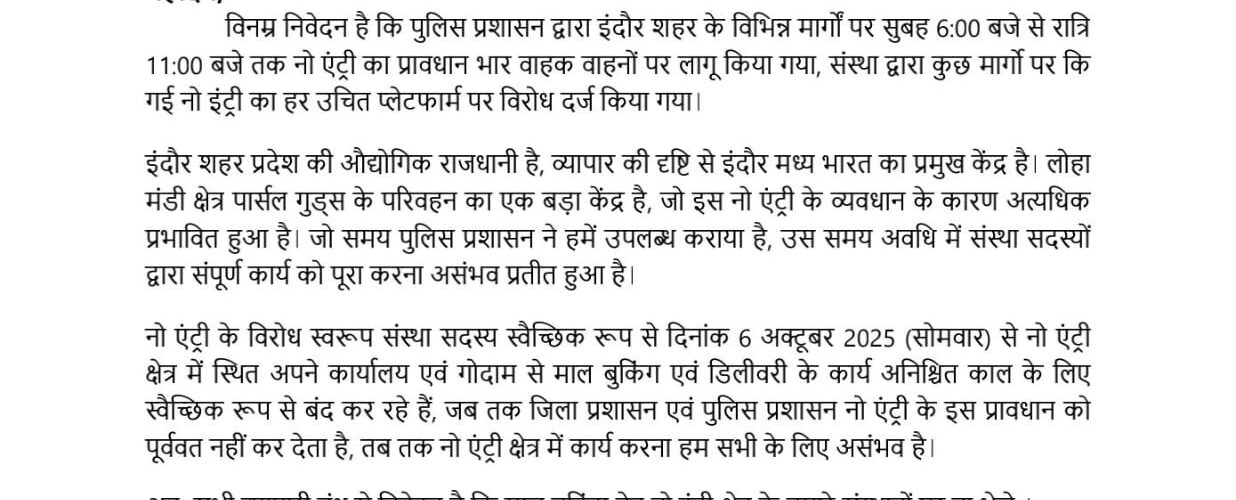 “एसोसिएशन ऑफ पार्सल ट्रांसपोर्ट एंड फ्लीट ओनर्स के अध्यक्ष राकेश तिवारी ने बताया कि पुलिस प्रशासन द्वारा इंदौर शहर के विभिन्न मार्गों पर सुबह 6:00 बजे से रात्रि 11:00 बजे तक नो एंट्री का प्रावधान भार वाहक वाहनों पर लागू किया गया है। संस्था द्वारा कुछ मार्गो पर कि गई नो इंट्री का हर उचित प्लेटफार्म पर विरोध दर्ज किया गया। ”